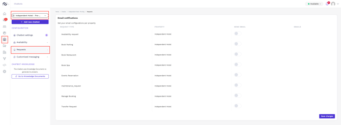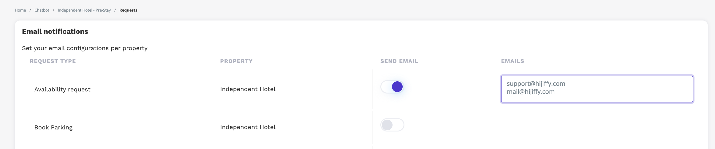 You will see a list of requests per hotel. To add the email address, click on the button next to the property name and insert the emails to where the specific requests should be send.